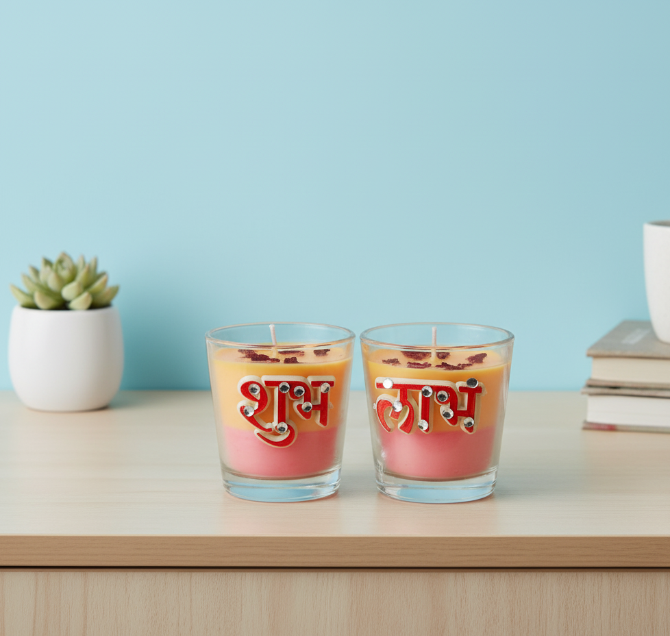🪔 Shubh Labh Shot Glass Set – Handcrafted candles in elegant shot glasses, symbolizing good fortune and festive vibes. Perfect for pooja, décor, and gifting.